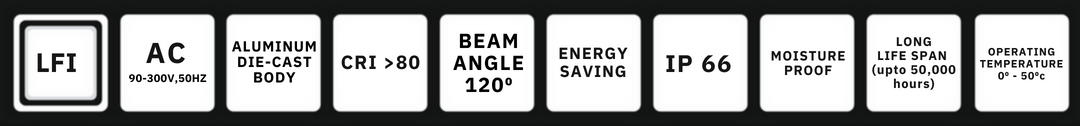 Lumirise LED floodlight luminaire comprises of die-cast aluminium, Control gear and LED housing with toughened glass fixed with a clamp.